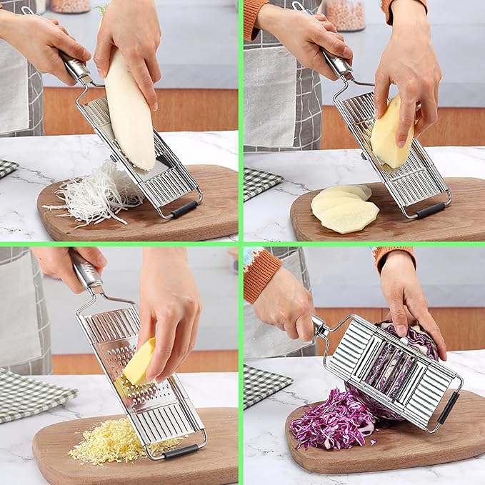 Овој мултифункционален алат е идеален за секој домаќин или кулинарски ентузијаст. Со него, ќе заштедите време и напор, истовремено добивајќи прецизни и квалитетни резултати. Неговиот компактен и ергономски дизајн ќе ви овозможи лесно и удобно користење, без да зазема многу простор во вашата кујна. Мултифункционалното ренде е иновативен кујнски алат кој ќе го трансформира вашето кулинарско искуство. Дизајнирано е со цел да ви го олесни и забрза процесот на рендање на различни видови на храна, но истовремено ви нуди многу други функции и предности. Одлично е изработено, од висококвалитетни материјали, издржливо и долготрајно. Со своите остри сечила рендањето на зеленчук, овошје и сирења ќе биде совршено. Неговата прецизност и ефикасност ќе ви овозможат да ги добиете тенки и рамни парчиња, што ќе го подобри визуелниот изглед на вашите јадења.