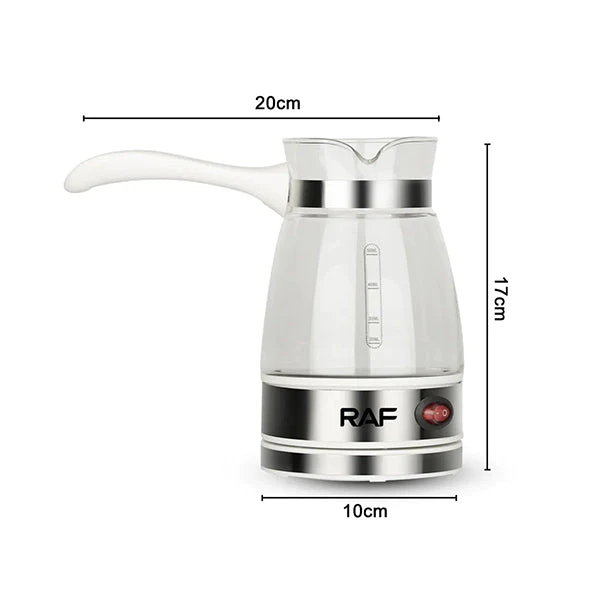 Електричното ѓезве од брендот РАФ е изработено од стакло со кое ќе о подготвите највкусното турско кафе за помалку од 1 минута. Електричното стаклено ѓезве за кафе е идеално за секој кој обожува да ужива во вкусно и свежо кафе. Неговиот капацитет од 500мл е доволно за да приготвите кафе за вас и вашите пријатели. Има вграден термостат кој ја контролира температурата на кафето, што ви овозможува да го задржите кафето топло и свежо подолго време. Ѓезвето е посебно од основата и тоа го прави повеќе практично за послужување на кафето.
