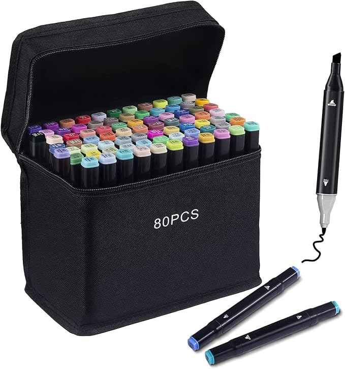 Овој комплет со 80 двострани маркери е идеален избор за уметници и креативци кои сакаат да создаваат уникатни и шарени уметнички дела. Со широкиот спектар на бои, можеш да се изразиш на начин кој најдобро ја отсликува твојата визија. Од светли и живописни нијанси до суптилни пастелни тонови, овој комплет ти нуди бескрајни можности за изразување. Секој маркер има двострана употреба, што го прави совршен за различни техники на цртање и боење. Тенкиот врв е одличен за прецизни детали, додека поширокиот врв е идеален за брзо пополнување на поголеми површини. Оваа флексибилност овозможува лесно прилагодување на маркерите според твоите уметнички потреби.